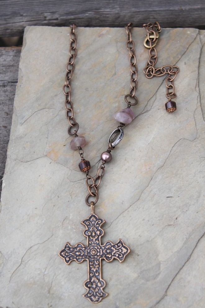 Bronze cross with Flourite Gemstones, pearl and glass beads from the Czech Republic