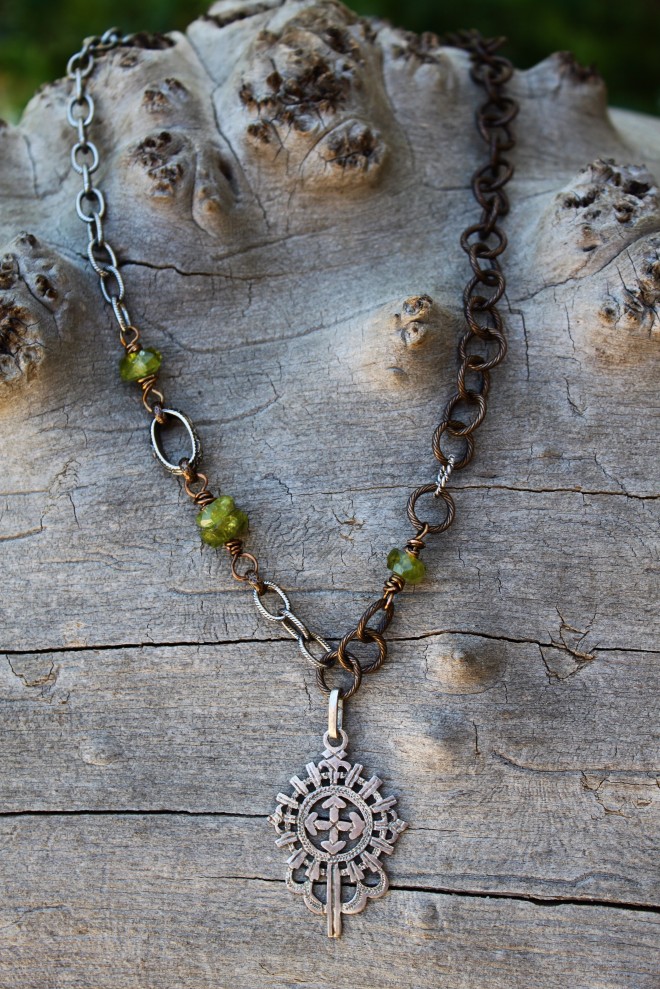 Handmade Ethiopian Coptic Cross from an artist in Ethiopia on silver filled and oxidized brass American made chain with natural green peridot gemstones.