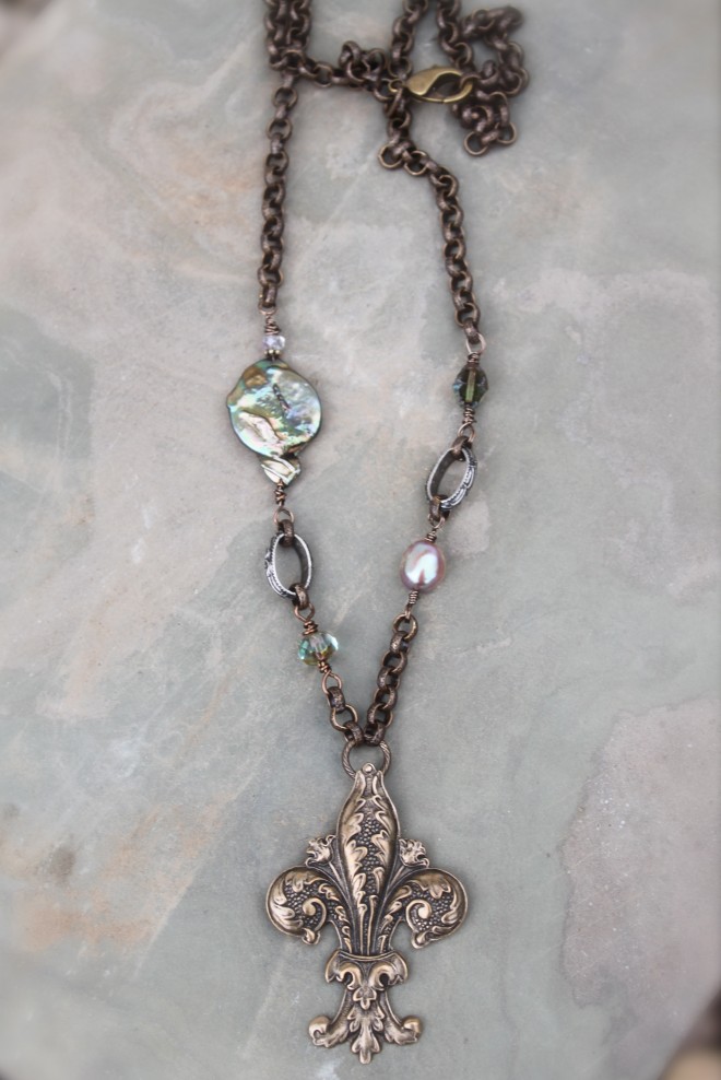 Fleur-de-lis Bronze Pendant on American made oxidized brass and silver filled chain with a beautiful iridescent green coin pearl, beads from the Czech Republic, & natural pink pearl.