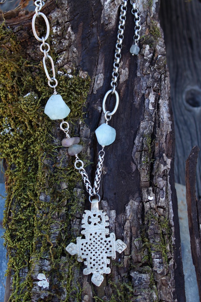 Beautiful aquamarine rough gemstone nuggets and purple flourite gemstones make up this Ethiopian Coptic Cross necklace