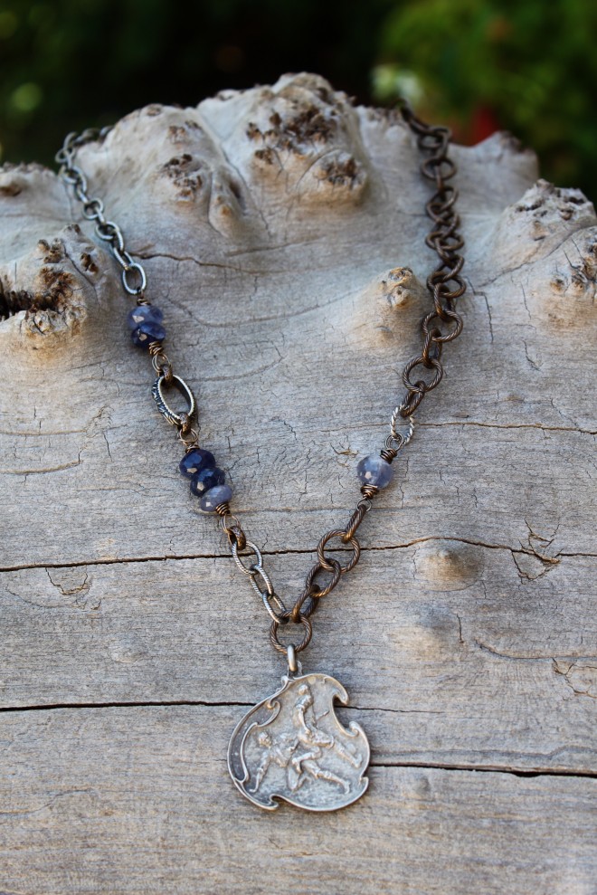 Soccer Mom Vintage Pendant Vintage Soccer medal from France on silver filled and oxidized brass American made chain with denim blue iolite gemstones