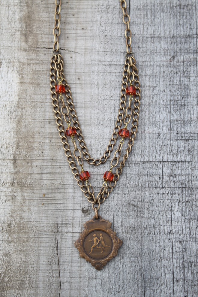 Vintage bronze medal from France on American oxidized brass chain with orange cathedral glass beads from the Czech Republic.